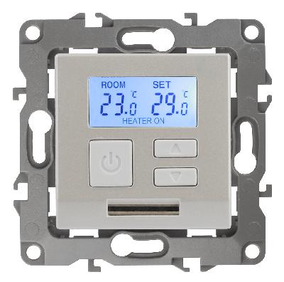 Терморегулятор теплый пол / отопление электронный серии Эра 12 СУ механизм цвет перламутр 12-4111-15. Номинальные характеристики 16А 230В. Сделана из поликарбоната. Монтаж в подрозетник производится и на лапки, и на винты. Рамки приобретаются отдельно. Рамки Эра 12: 1 пост 12-5001-хх, 2 поста 12-5002-хх, 3 поста 12-5003-хх, 4 поста 12-5004-хх, 5 постов 12-5005-хх. Рамки Эра 12 Сатин: 1 пост 12-5101-хх, 2 поста 12-5102-хх, 3 поста 12-5103-хх, 4 поста 12-5104-хх, 5 постов - 12-5105-хх (хх - код цвета: 01-белый, 02-слоновая кость, 03-алюминий, 04-шампань, 05-антрацит, 06-чёрный, 07-ольха(белёный дуб-сатин), 08-вишня, 09-дуб, 10-венге, 11-сосна, 21-жёлтый, 22-оранжевый, 23-красный, 24-охра, 25-бордо, 26-лайм, 27-зелёный, 28-голубой, 29-синий). |